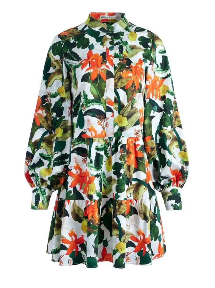 This dress is ready for a warm weather getaway with it's perfect tropical print. It includes a high neckline, elastic waist, tiered skirt and dramatic blouson sleeves. In other words, it's your new favorite travel companion.