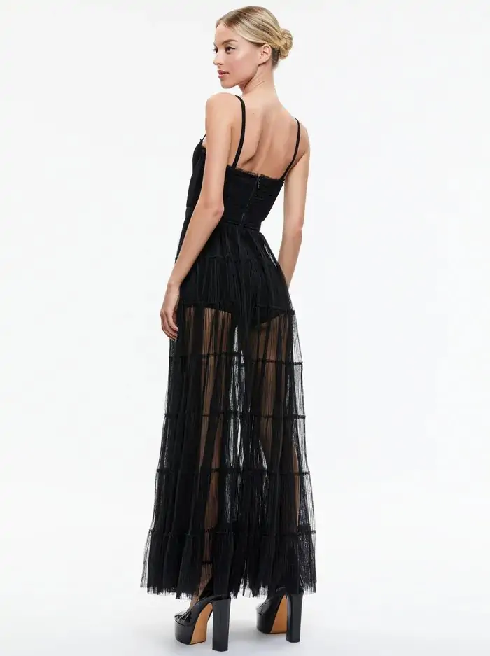 This gorgeous maxi dress has ballet vibes, with a tulle overaly and camisole construction. It's lined where you need it to be, but is left ethereal and transparent in all the right places, too.