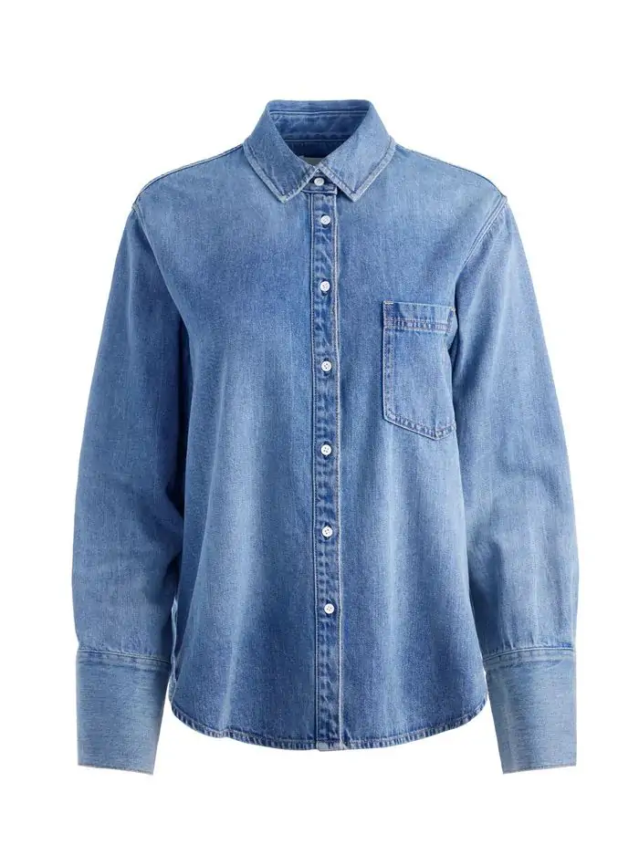 A wardrobe staple = this denim shirt with buttons up the front and an oversized fit. It's our new favorite piece to layer over everything. Wear it with more denim, with leather or with a printed pant. You'll love its versatility.