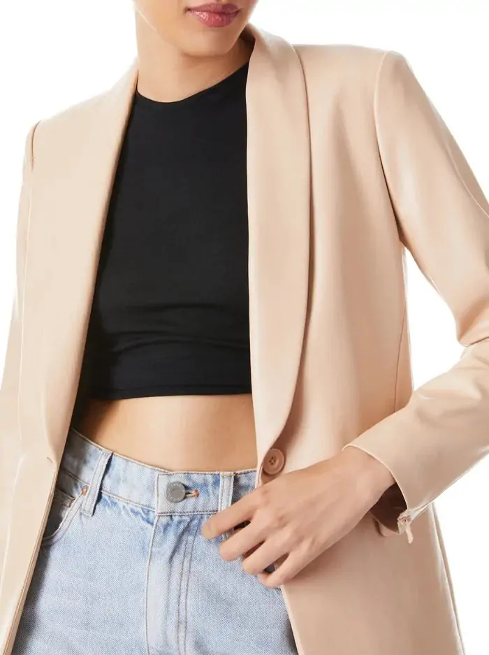 Our signature slim-cut blazer, now in vegan leather, quickly elevates your look to boss babe status. This one has front pockets and button front closure.