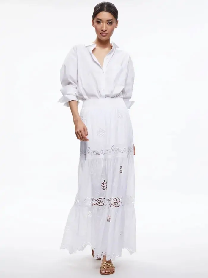 An easy, flowy maxiskirt with a paneled design that's just so romantic and easy. This includes a smocked waistband and eyelet lace details-making it totally perfect for any day of the week.