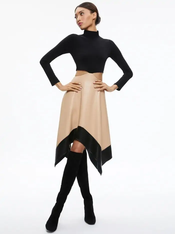 An alluring midi dress, meet Tamika. She includes a vegan leather skirt, side cut-outs, long sleeves and an asymmetric hem. She gives the effect of two pieces in one, but no styling tricks are needed.