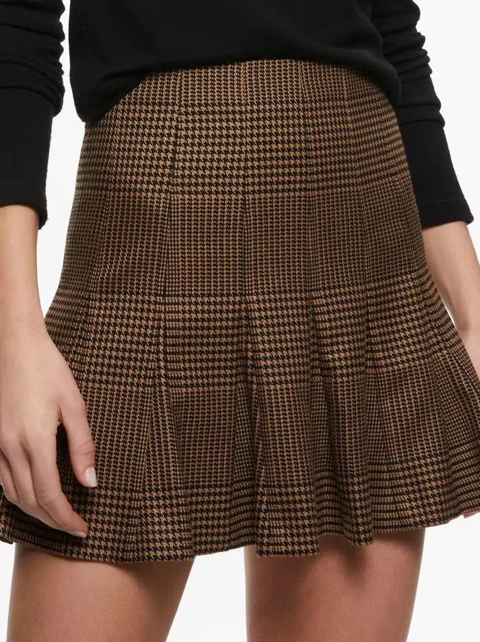 Both flirty and sophisticated, this mini skirt includes a godet hem, high waist, back zip closure and a classic plaid pattern. It's crafted in a mix of recycled polyester, viscose and elastane (so it has just enough stretch).